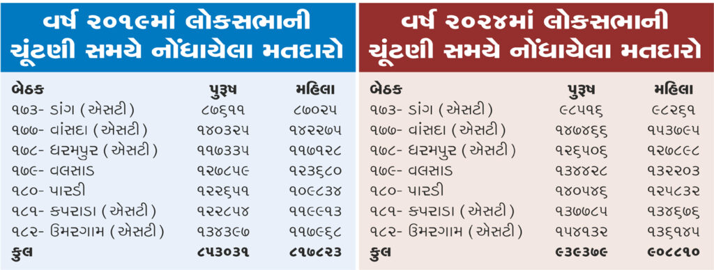 આ જ રીતે વલસાડ જિલ્લાની 178 ધરમપુર (એસટી) બેઠક પર વર્ષ 2019માં 117335 પુરૂષ અને 117128 મહિલા મતદારો નોંધાતા 207 મહિલામતદારો ઓછા હતા પરંતુ અત્‍યારે વર્ષ 2024ની મતદાર યાદીમાં ધરમપુર બેઠક પર મહિલાઓ આગળ નીકળી ગઈ છે. હાલ વર્ષ 2024માં આ બેઠક પર 126506 પુરૂષ મતદારો અને 127898 મહિલા મતદારો નોંધાતા મહિલા મતદારો 1392 વધુ નોંધાઈ છે, જેથી આ બેઠક પર અંદાજિત પાંચ વર્ષમાં પાંચ ગણો વધારો નોંધાયો છે. આ સિવાય 173 ડાંગ (એસટી), 179 વલસાડ, 180 પારડી, 181 કપરાડા (એસટી) અને 182 ઉમરગામ (એસટી) બેઠક પર પુરૂષોનું પ્રમાણ વધુ જોવા મળી રહ્યું છે.