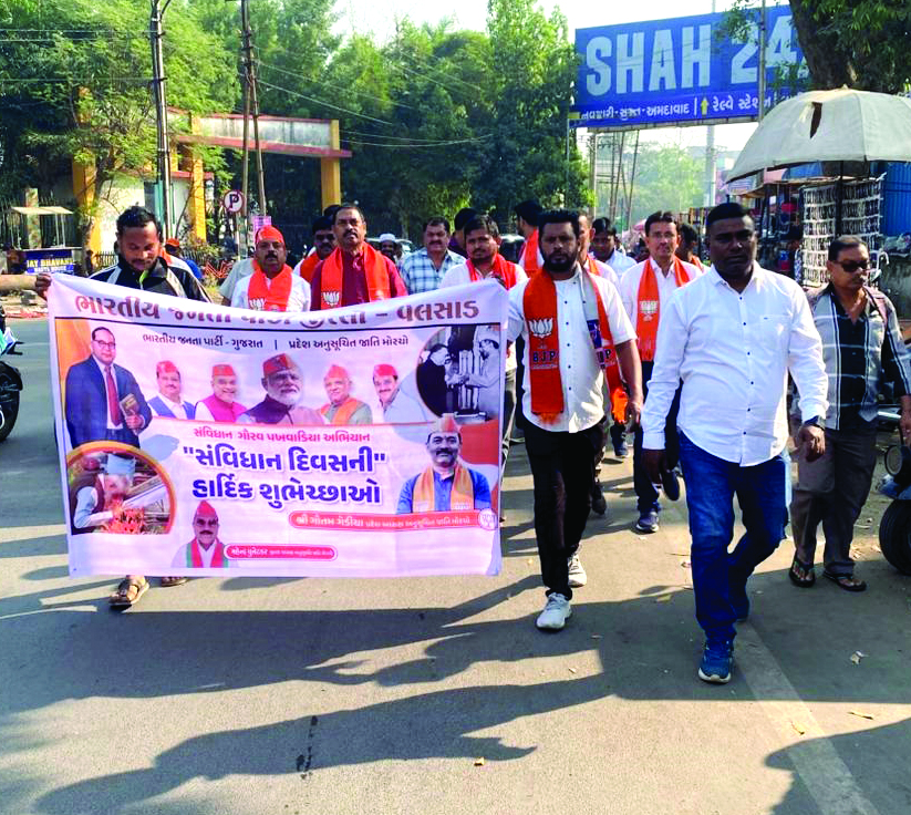 દમણ, તા.27: આજરોજ ડો. બાબાસાહેબ આંબેડકરના સાનિધ્યમાં સંવિધાન ગૌરવ દિવસની ઉજવણીના ભાગરૂપે પ્રદેશ ભાજપ સફાઈ કામદાર સેલના અધ્યક્ષ શ્રી સુરેશભાઈ મકવાણા તેમજ વલસાડ જિલ્લા ભાજપ મહામંત્રી શ્રી કમલેશભાઈ પટેલના માર્ગદર્શન હેઠળ તેમજ વલસાડ જિલ્લા ભાજપ અનુસૂચિત જાતિ મોરચાના પ્રમુખ શ્રી મહેન્દ્રભાઈ પુનેટકર, પ્રભારી શ્રી ચંપકભાઈ પરમારની ઉપસ્થિતિમાં વલસાડ કલ્યાણ બાગ ખાતે ડો. બાબાસાહેબ આંબેડકરની પ્રતિમાને પુષ્પાંજલી અર્પણ કરવામાં આવી હતી તેમજ યાત્રા રૂપે સંગઠનના આગેવાનો સાથે રેલી યોજી ડો. બાબાસાહેબ આંબેડકરની જીવનગાથા વિષે માર્ગદર્શન આપ્યું હતું.